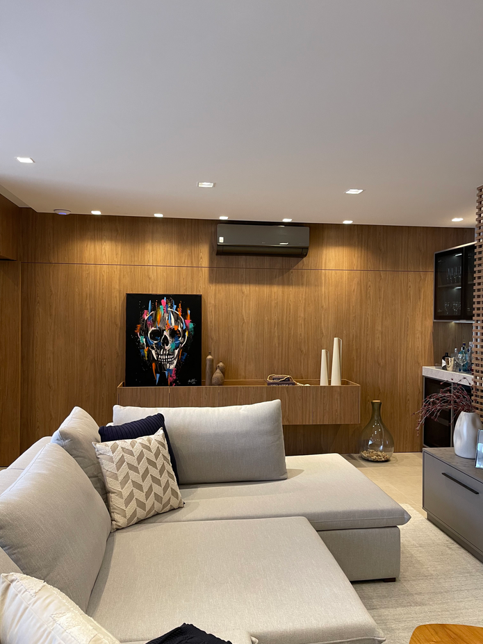 Espaços totalmente integrados sendo: cozinha, sala de estar e TV, sacada gourmet e jantar. Utilizamos tons de cinza, amadeirado, cimento queimado, travertino romano bruto, e integramos elementos como o envelopamento de todas as paredes em painel amadeirado, muxarabi no painel da TV e a lareira para trazer muito aconchego e sofisticação.