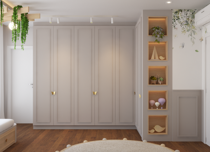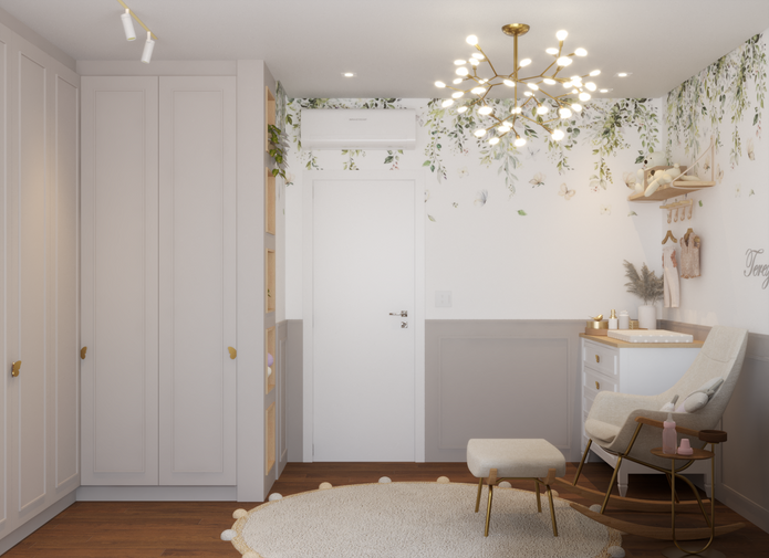 Para o quarto, adotamos uma paleta de cores mais neutra para trazer aconchego e tranquilidade, saindo do convencional. Os elementos lúdicos ficaram por conta da decoração, lustre, puxadores de borboleta e a pintura nas paredes.