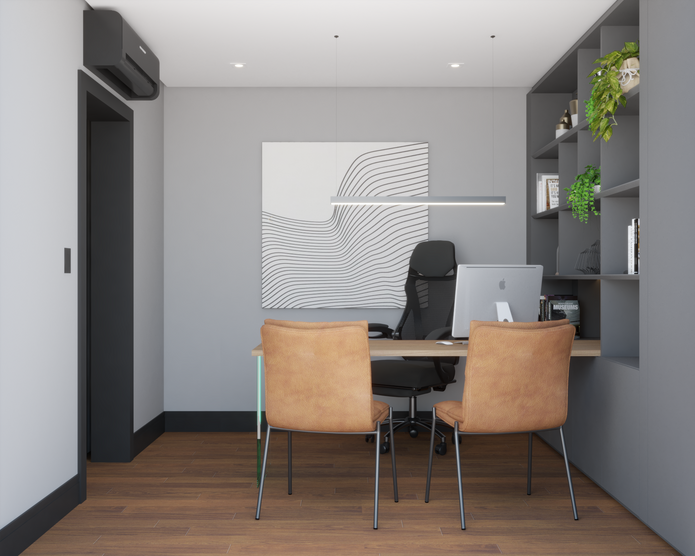 Para o escritório, mantivemos os móveis existentes, e selecionamos os demais elementos do espaço de forma que integrassem o estilo original, criando um espaço coerente e harmônico.