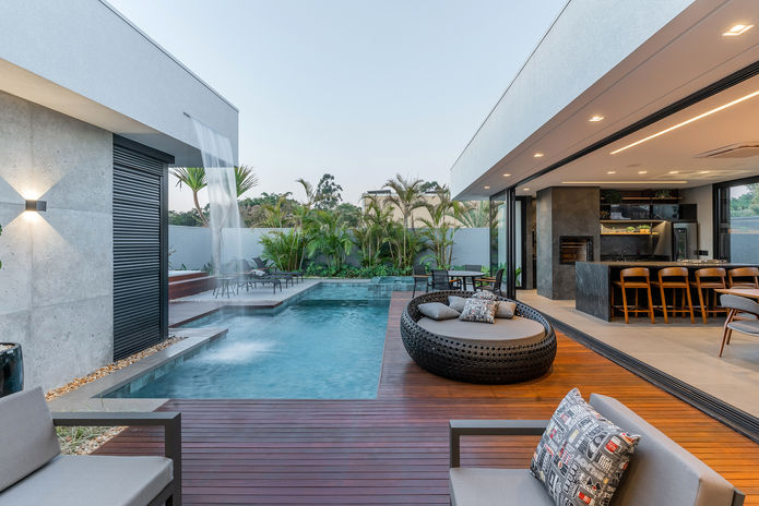 E para garantir o aconchego no espaço gourmet, trabalhamos a composição com toques amadeirados, detalhes em couro em algumas peças e a iluminação mais quente. Dessa forma, criamos uma conexão com o amadeirado do deck e um contraste com o revestimento da piscina e os tons escuros, deixando tudo em total harmonia.