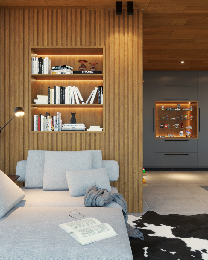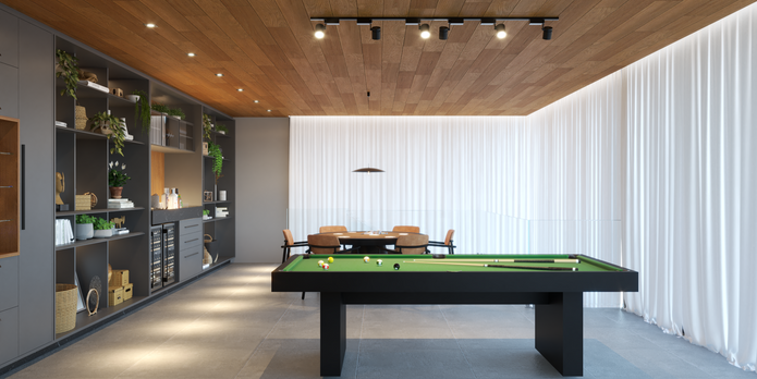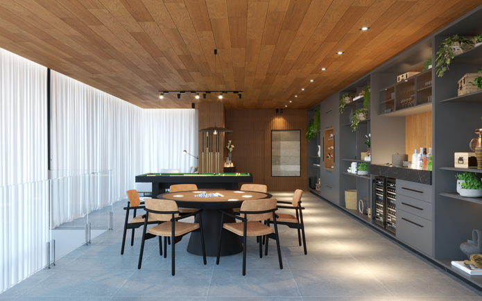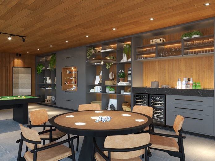 Essa obra trata-se de uma reforma e ampliação de uma residência existente. Acima do novo espaço gourmet, propomos uma ampla sala de jogos que comporta diversas atividades diferentes como sinuca e jogos de cartas. O espaço conta ainda com expositor para peças colecionáveis e bastante espaço para armazenamento de decorações e jogos de cartas/tabuleiro. Projetamos também um espaço bar e um espaço dedicado a leitura e relaxamento.