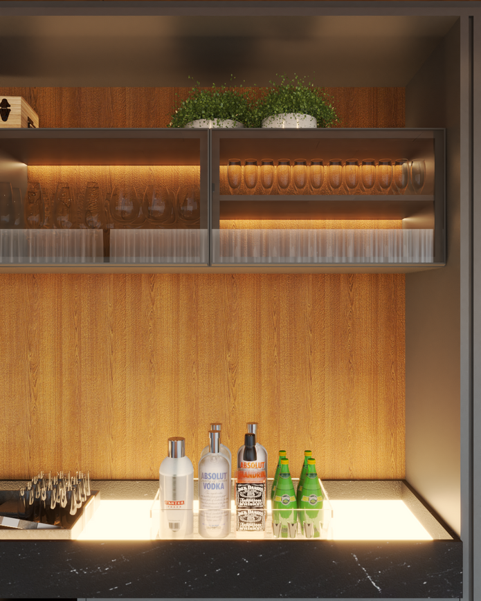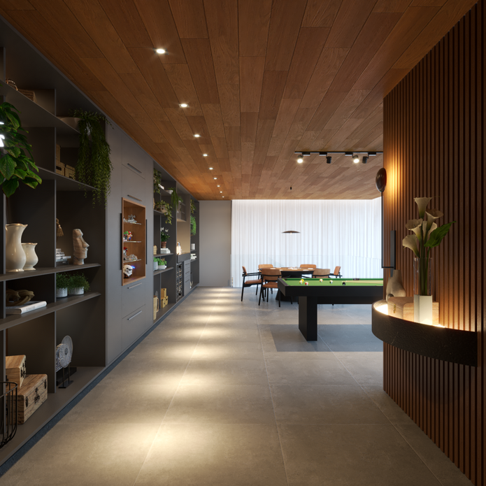 Exploramos bastante o uso da madeira e pontuamos iluminação estratégica em diversos pontos nesse espaço para trazer a sensação de acolhimento e conforto para os usuários.