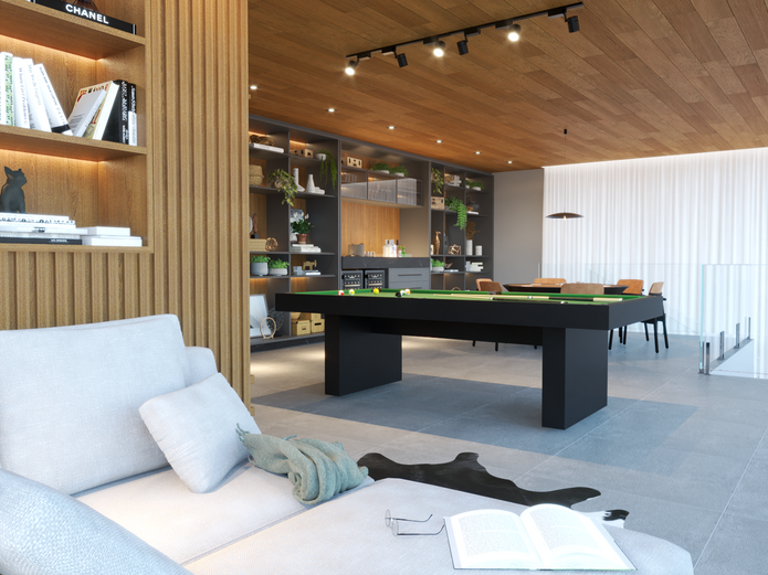 Resultando assim em um ambiente multifuncional e agradável para as mais diversas atividades desde relaxar com um bom livro até se divertir jogando com os amigos.